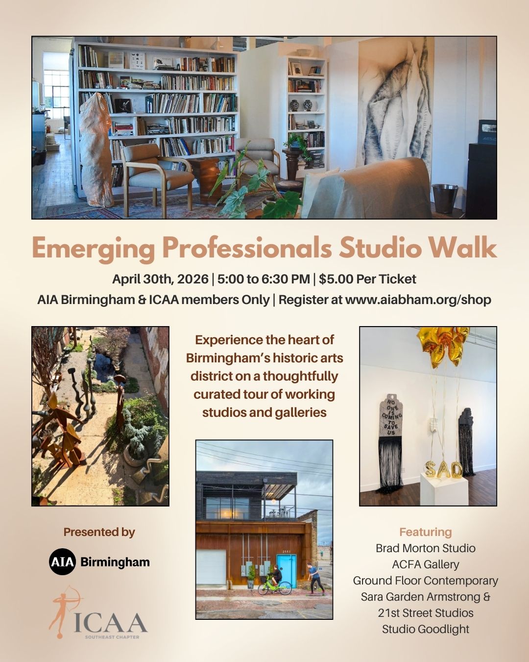 Join the Emerging Professionals for a walking tour of Birmingham's historic arts district! 5:00 - 6:30 PM | Tickets $5 (AIA Birmingham & ICAA Members Only)