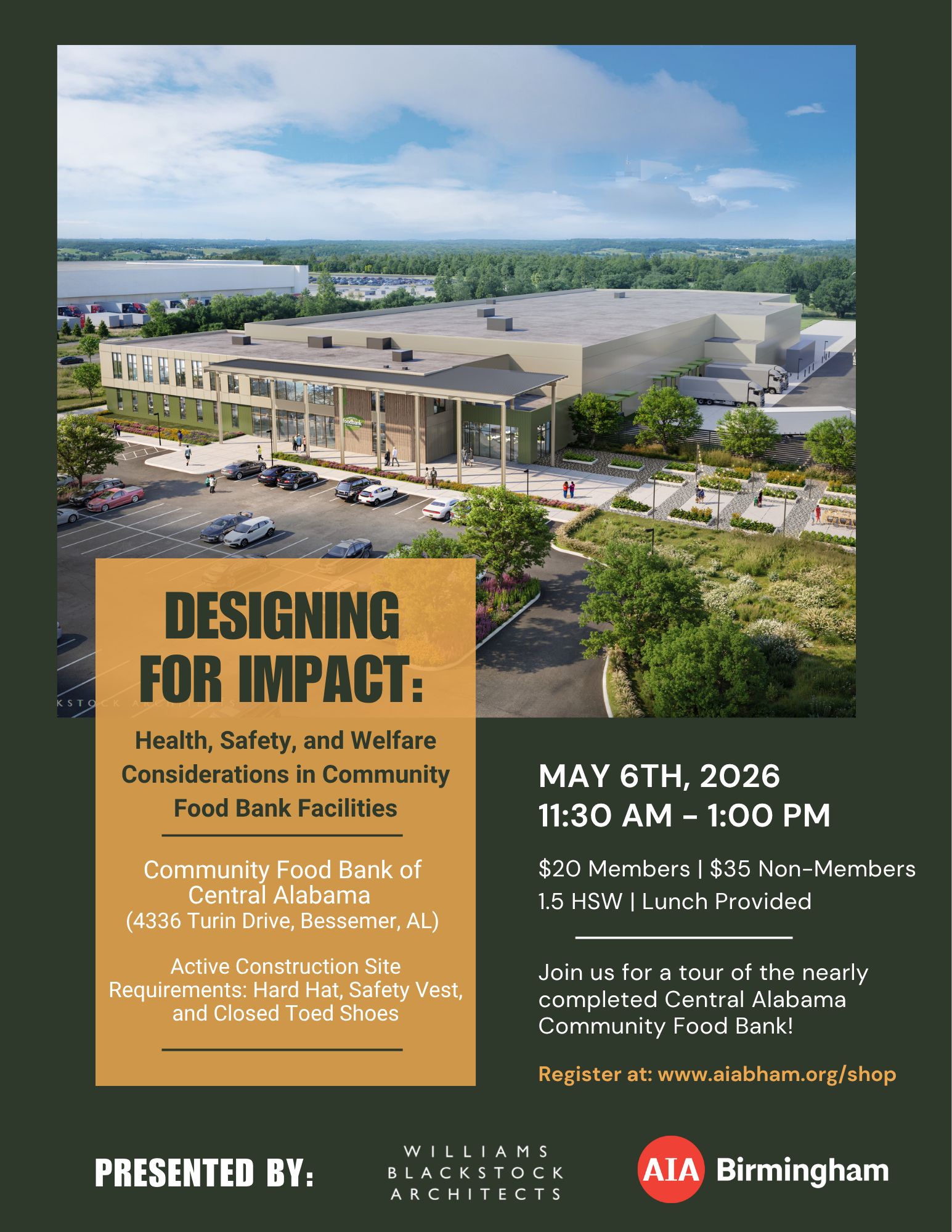 1.5 HSW | $20 Members | $35 Non-Members | Lunch Provided Join us for a tour of the nearly completed Central Alabama Community Food Bank! Register Here!