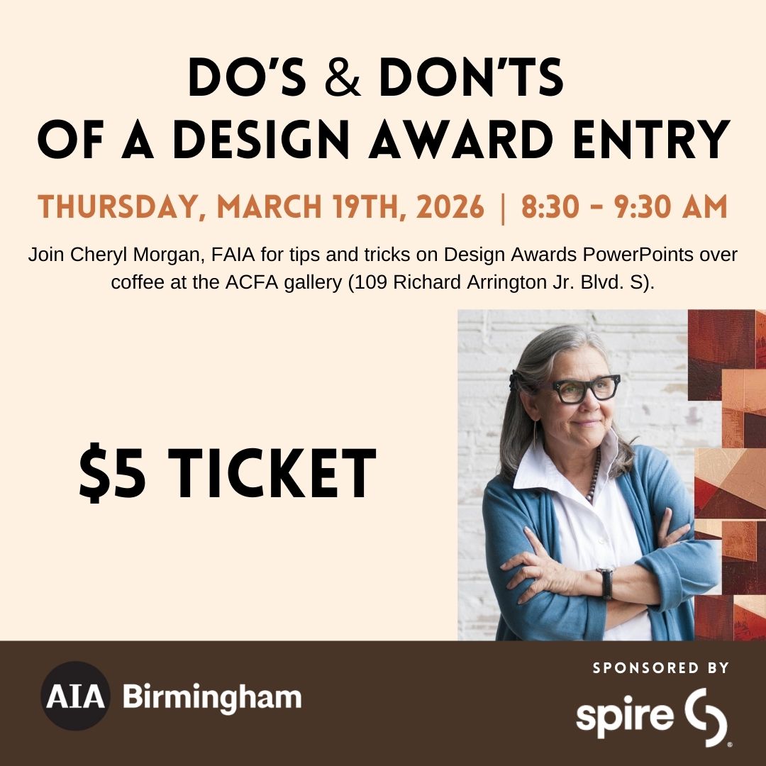 Join Cheryl Morgan, FAIA for tips and tricks on Design Awards PowerPoints over coffee at the ACFA gallery (109 Richard Arrington Jr. Blvd. S).